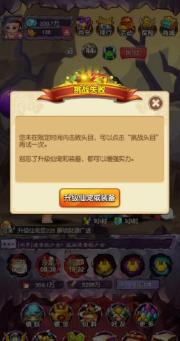 要是玩家没能在规定时间内击败boss,系统就会自动让玩家返回上一层关卡继续刷怪,直到玩家主动点击挑战boss为止。