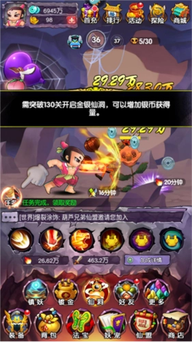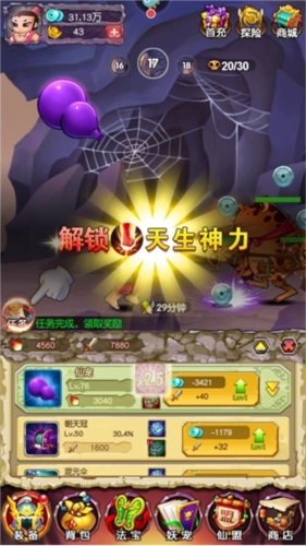 这个时候仙洞就能派上用场了。游戏里一共有3个仙洞,分别是金银仙洞、镀金仙洞和灵石仙洞,它们的产出各有不同,金银仙洞能带来银币加成,镀金仙洞提供镀金守护加成,灵石仙洞则是原石加成。仙洞的产出需要依靠妖宠驻守,妖宠的等级和品质越高,产出就越丰厚。此外仙洞还可以进行升级,升级后能获取更多资源,这对于提升战力和冲关都有很大的帮助。