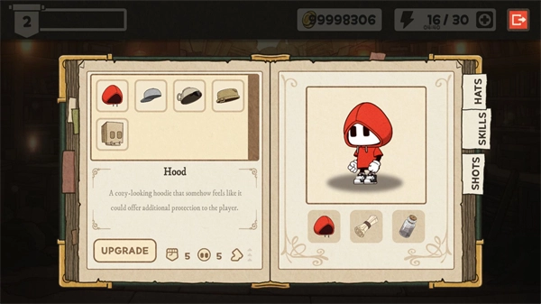 在主界面点击inventory,既能通过装备不同帽子来使用独特能力,也能对自身装备进行升级。