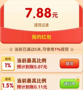 通过第一关后可以先提取0.2,不过后面的提现门槛会高很多。尽量多领些红包,这些红包也是按照百分比来计算提现额度的。