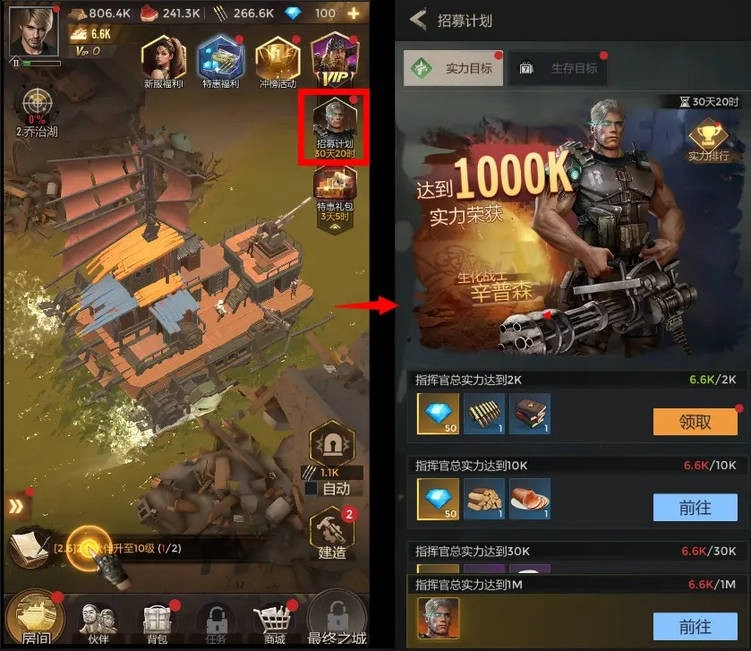 每天参与“招募计划”下的“生存目标”任务,积累活跃点数,就能兑换丰富的末日生存物资和钻石福利。