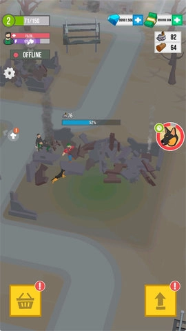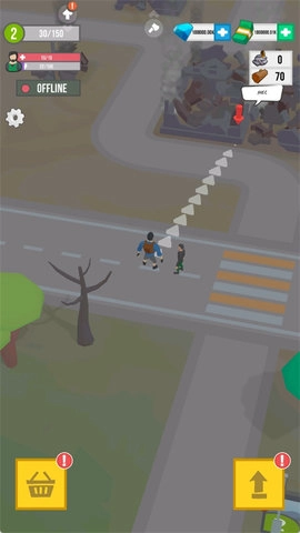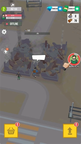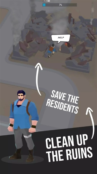 进入游戏后,通过拖动左侧的透明轮盘来操控角色移动。当角色走到红色箭头指示的位置时,就会自动启动清理废墟的动作。