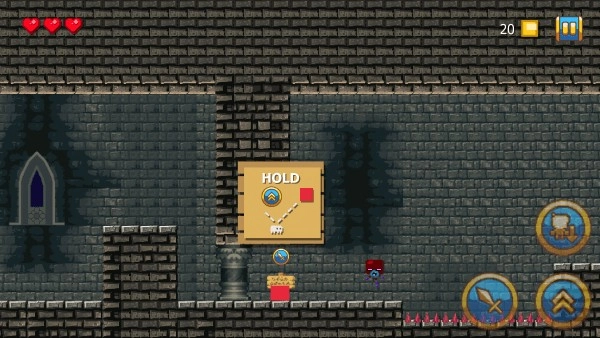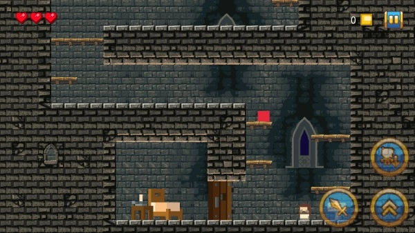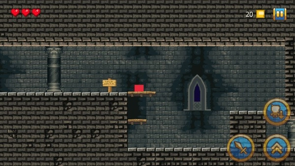 3、刚开始你会控制一个红色的小方块,遇到物品或对话时,点击小剑来互动;需要跳跃时,就点上方的箭头。