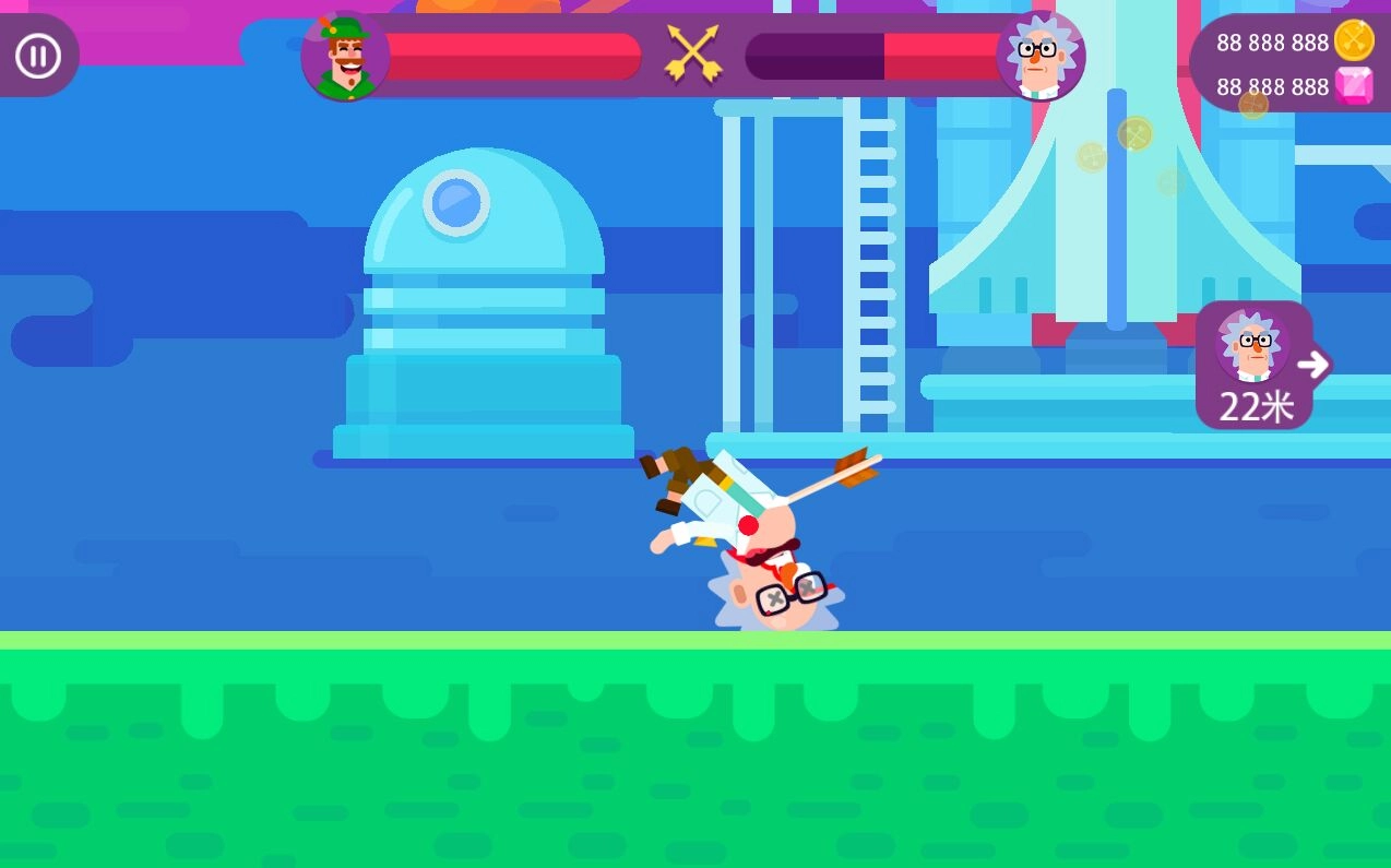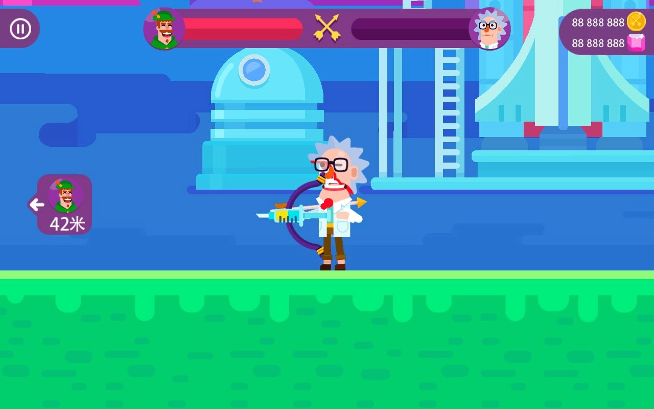 实际上游戏操作并不复杂,玩家只需点击屏幕就能调整角色的射击角度与力度,只要在出手前看清敌人位置,再依此行动就行。而在最基础的敌我互射模式里,得赢下足够场次才能解锁更多新玩法,比如打猎野鸭、射苹果大挑战,或是支持双人PK的对战模式等。