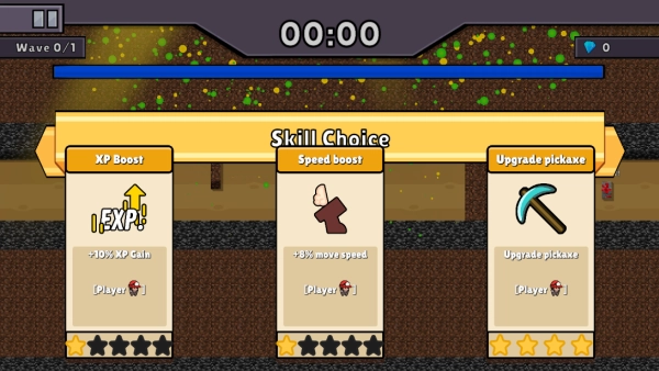 2. 角色等级的提升需要收集矿石,之后可以从三个随机出现的BUFF里挑选一个,以此增强自身实力。