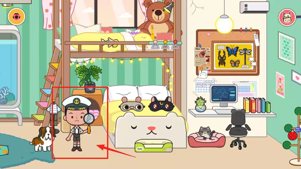 4、点击双层床旁那个拿着放大镜的男孩,和他一同玩寻宝游戏。