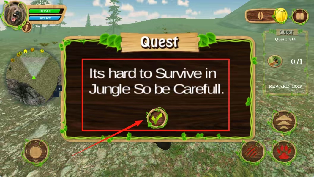 2、游戏开始后,会弹出任务提示,看完后点绿色对勾确认。任务就是小心在丛林里生存,别被危险的东西伤到。