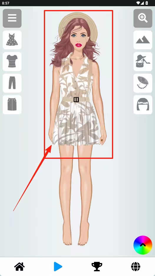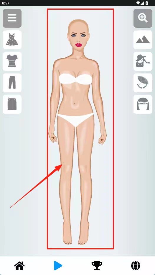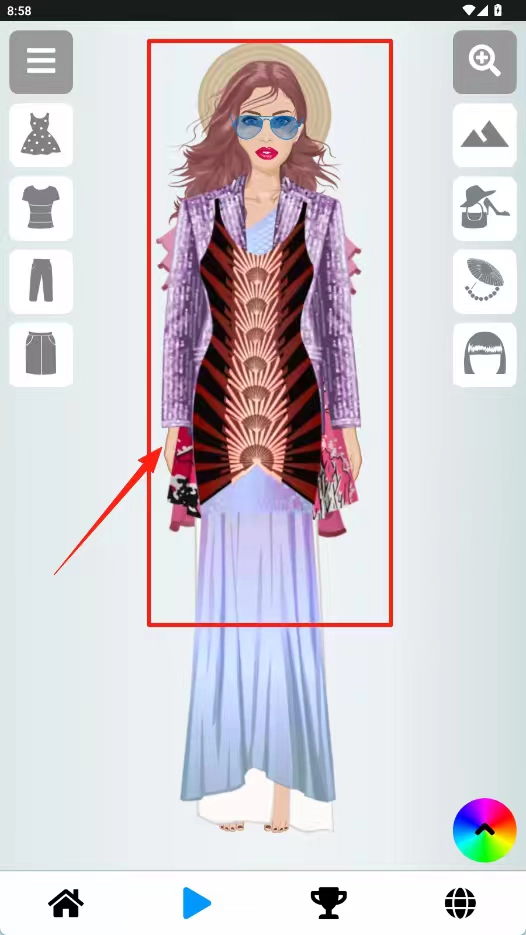 2、留意中间的女模特,从左右两边的图标里挑选衣物和饰品,底部的四个按钮是用来切换不同功能页面的。