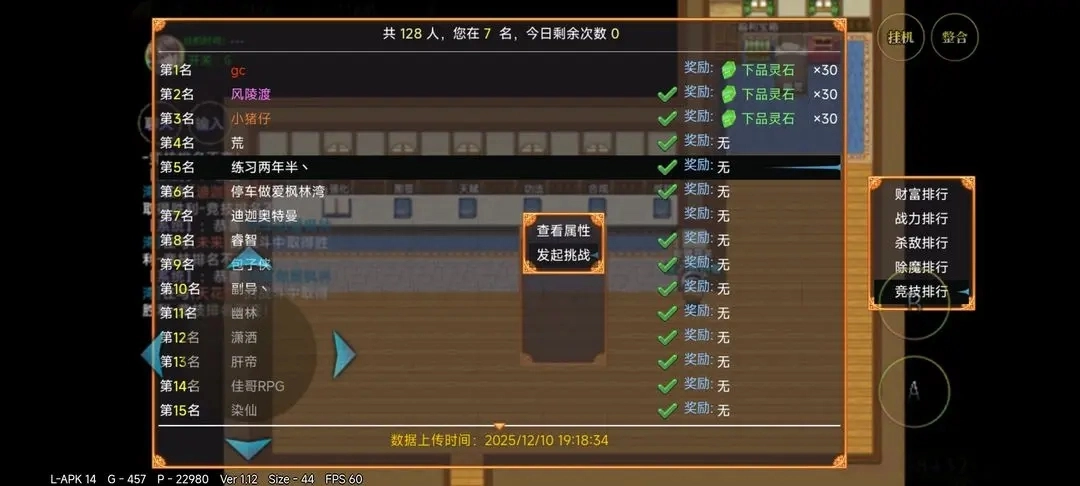 点“排名”→竞技→选择队手,如下图进行查看对手和挑战(挑战弱于你的,最好对方是5人队伍,这样经验和掉落会高一点)→查看自身排名点A键可以领奖励(周一,六能领)