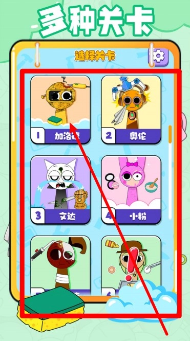3.选择关卡界面中包含六位不同角色,玩家可点击对应头像进入相应区域,体验多样主题与互动事件。