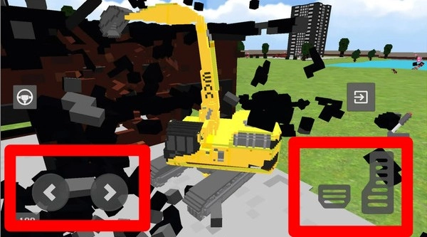 3.驾驶操控:画面两侧按钮分别控制方向与油门刹车,玩家可精准操控机械设备,完成建筑破坏与移动操作,增强驾驶与战斗体验。