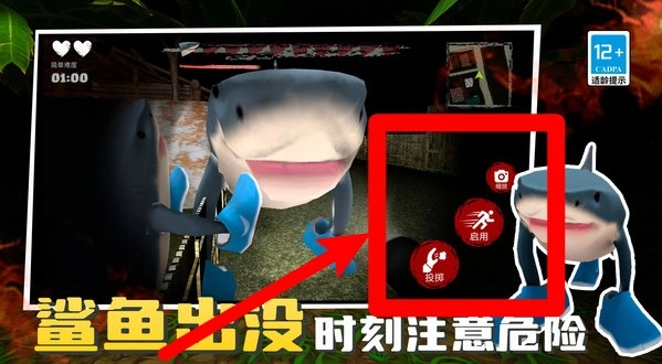 3.右侧功能按钮:启用奔跑与搜敌等动作,遭遇鲨鱼怪时及时加速撤离,注意体力消耗与声音暴露风险。