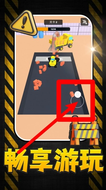 3.右下角的虚拟摇杆为主要移动控制,拖动即可操控车辆精准收集砖块,运送至目标区域以完成当前收集任务。