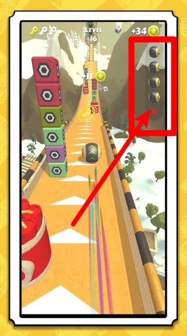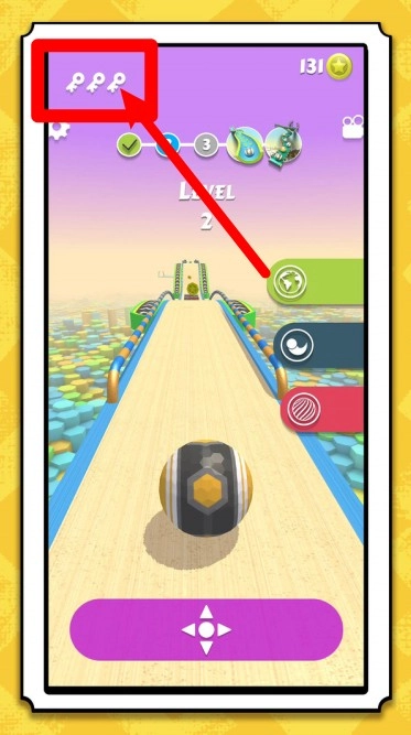 1.右侧显示当前球球的剩余数量,每次撞击到障碍物或掉落都会减少一个,需谨慎操作避免损失。