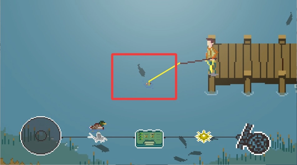 2、发现鱼群后点击鱼竿按钮准备抛竿,这时水面会呈现鱼群游动的轨迹,要把握好最佳下钩时机。