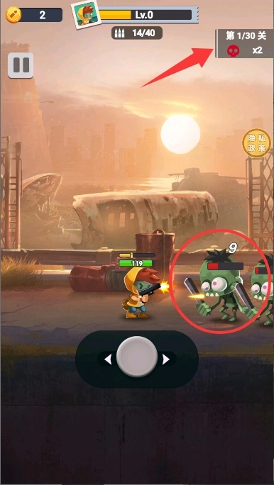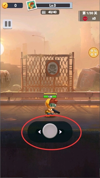 1、进入游戏后,按住屏幕左右滑动来调整角色的移动方位,以此操控角色灵活移动,同时锁定移动过程中遇到的敌对目标发起攻击。