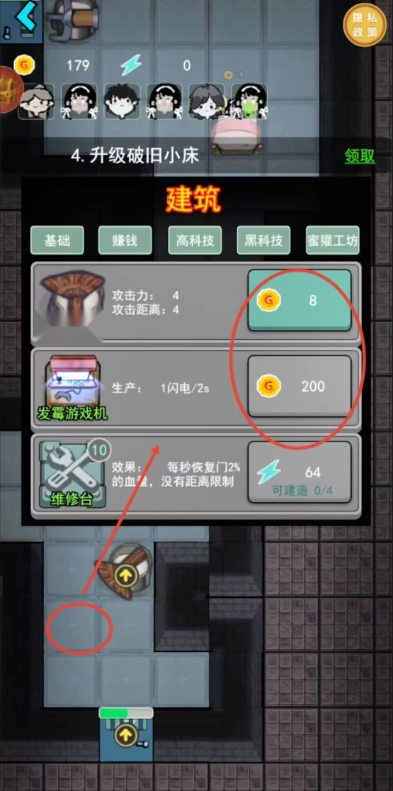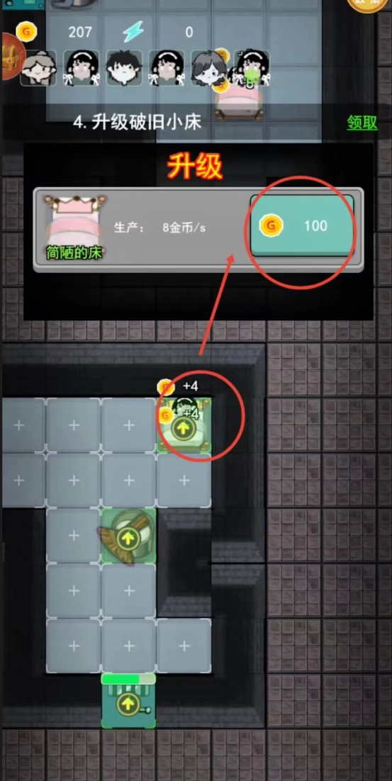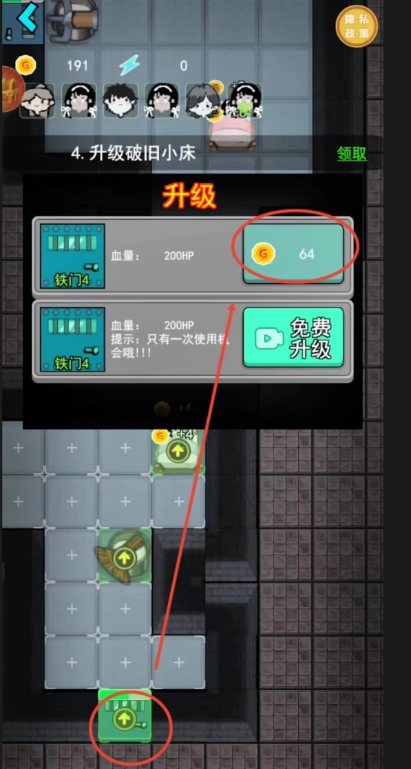 1、游戏开局阶段要快速进入空房间并跳上床铺,系统会自动锁住房门。马上投入金币强化门的防御能力,借助升级界面提高耐久值来增加抵抗时长。