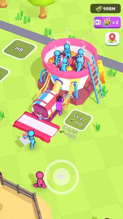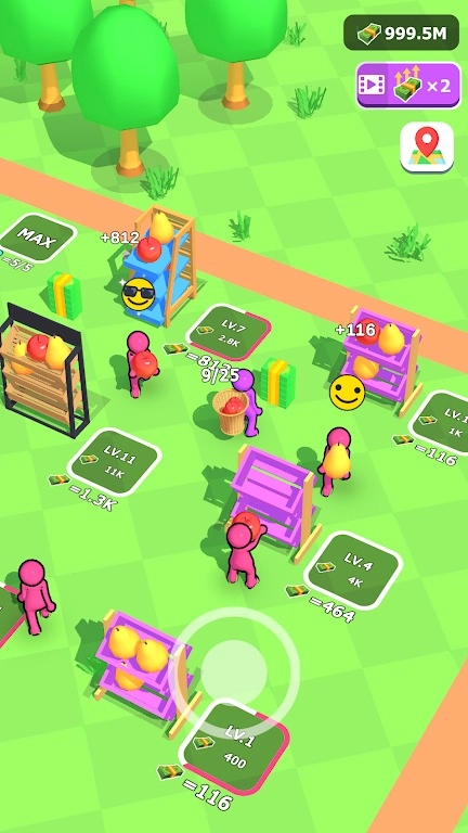 3.赚取金币后,可以雇佣更多员工来协助采摘和运输,同时升级榨汁机以提高生产速度。