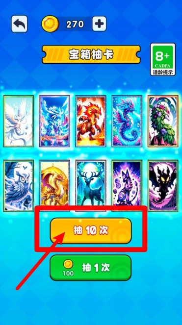 3.宝箱十连抽卡:点击“抽10次”按钮可快速获取大量新卡片,增加图鉴丰富度,也有机会获得稀有闪卡角色。