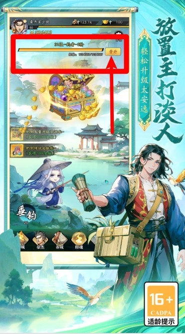 1.挂机晋升按钮:主界面右上角的“晋升”按钮可提升挂机收益等级,提高离线获得金币、经验等资源的效率。