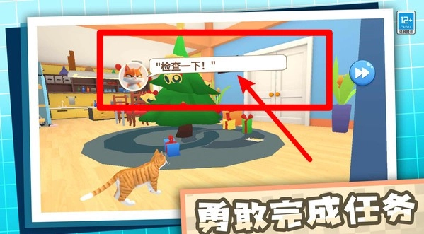 当靠近圣诞树时,会弹出“检查一下!”的提示气泡,点击该气泡即可触发调查任务,进而开启猫咪与圣诞树的互动流程。