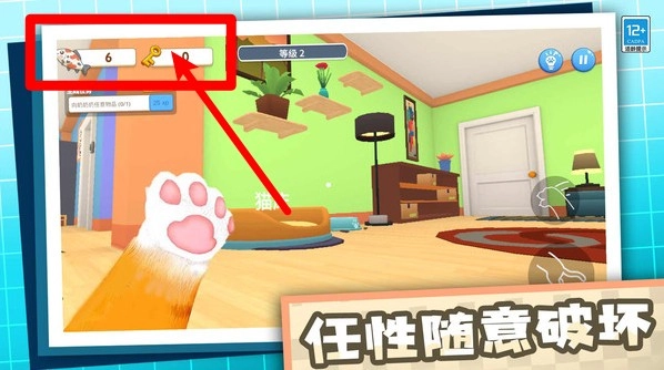 2. 左上角展示猫爪的数量以及钥匙的进度,玩家可以通过抓挠家具或者推倒物品来获取奖励资源,这些资源能够用于后续解锁更多的玩法。