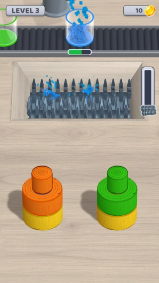 玩家可通过点击或滑动操作来控制粉碎机的移动轨迹,当粉碎机与彩色木块发生接触时,便会自动对木块进行研磨粉碎处理。而粉碎后产生的碎屑,则会自行归集到与木块颜色相匹配的玻璃容器内。