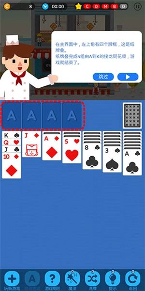 游戏界面左上角的四个牌框是目标区域,当你成功集齐4组从A到K按顺序排列的同花顺时,即可获得胜利。