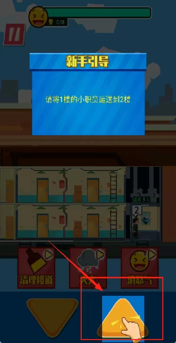 按红色框内的上箭头将电梯升至2楼,即可完成运送小职员的任务。