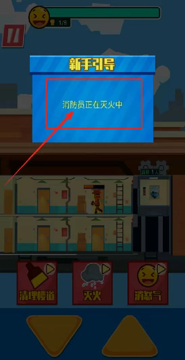 消防员完成灭火工作后,请点击下方中间位置的灭火按钮来应对紧急状况。