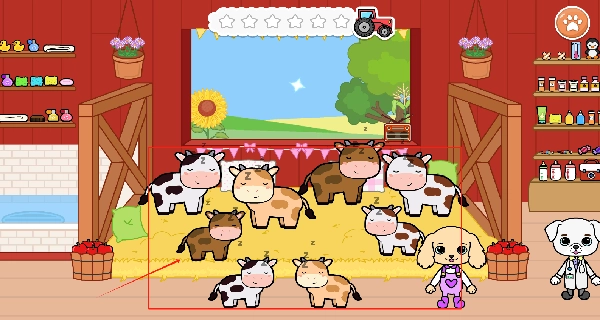 点击那些正在睡觉的奶牛,它们就会苏醒过来,还能和小狗医生进行互动,你也可以看看谷仓里面都有些什么东西。