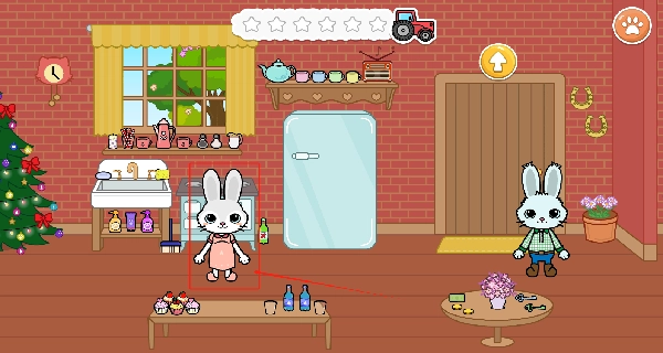 点击兔子家的门或者冰箱,既能做饭、装饰圣诞树,也可以用桌上的物品来布置房间。