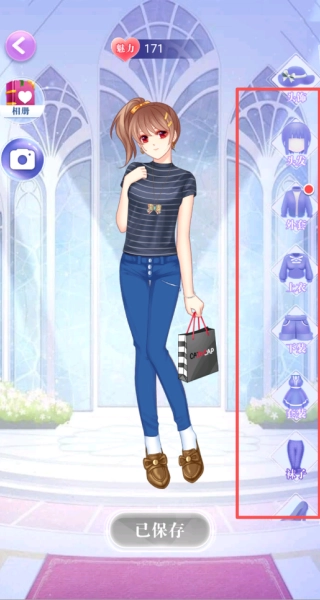 在服饰搭配界面,可借助右侧的上衣、下装、鞋子等分类选项,自由组合各类服饰单品,搭配出心仪造型后进行保存。