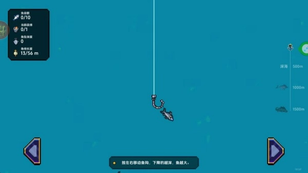 左右移动鱼钩,成功钓住小鱼,鱼钩下潜得越深,钓上来的鱼个头就越大。