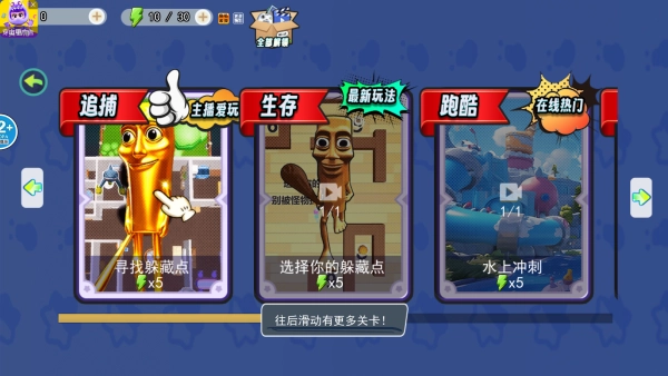 一共有追逐、生存和跑酷三大玩法可供选择,你可以根据自己的喜好进入相应挑战。