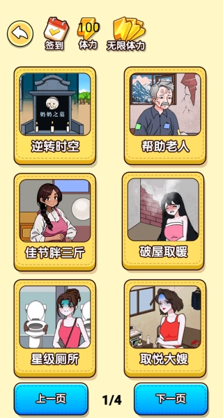 包含了逆转时空、帮助老人、佳节胖三斤、破屋取暖、星级厕所等玩法,随你自由选择。