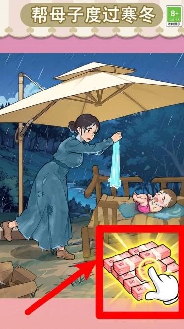 3. 寒夜里,母亲在雨中撑着伞,一边洗衣一边照看婴儿,刺骨的寒风中她默默忍受,却依旧坚强地支撑着生活。若您想给予温暖援助,点击金钱即可献上一份心意。