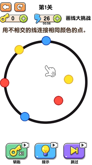 进入游戏后,选择第一关,用不相交叉的线连接相同颜色的点就行。