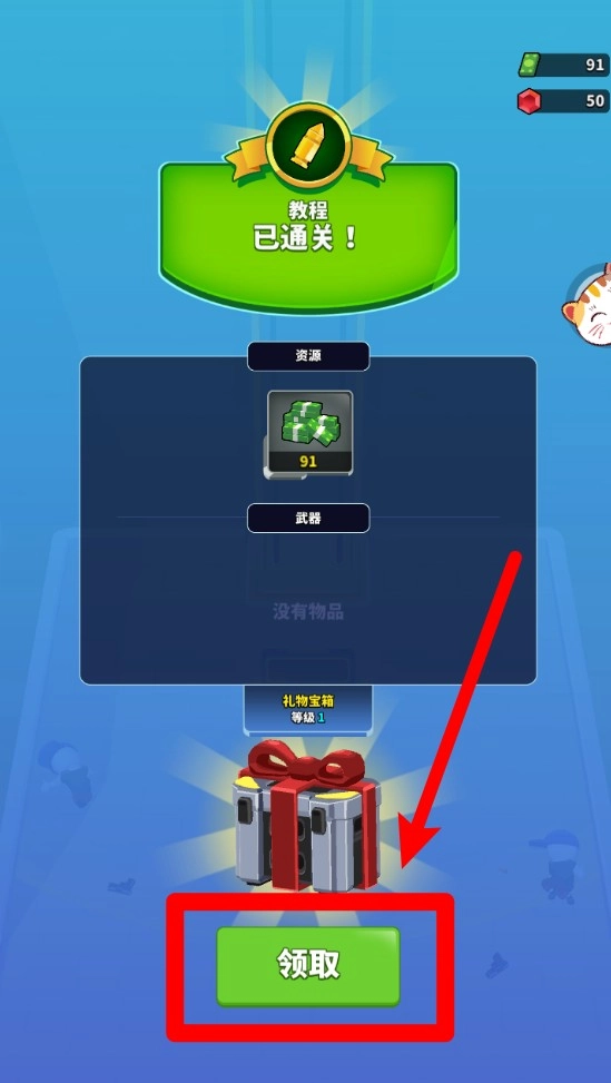 完成教学关卡后能够领取通关奖励,点击下方绿色的“领取”按钮就能获得资源、宝箱等基础奖励。