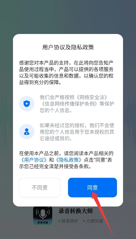 首次使用小恶魔变声器时,系统会弹出用户协议与隐私政策的阅读提示,点击同意按钮即可进入应用。