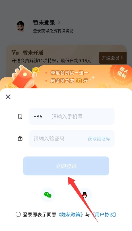 3、填写手机号码并获取验证码,阅读并勾选用户协议,确认信息无误后点击立即登录按钮即可完成登录操作。
