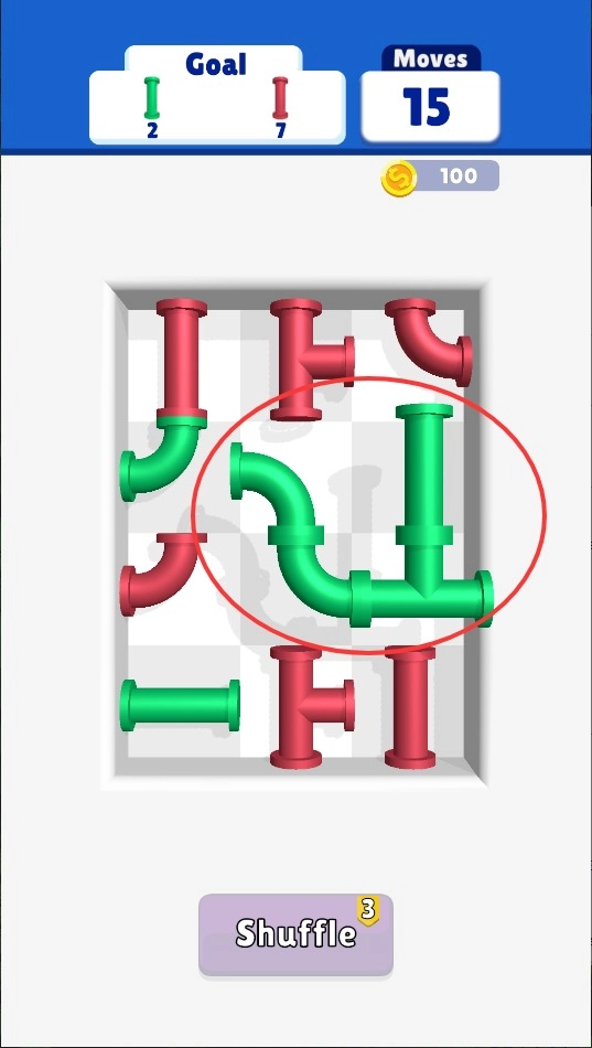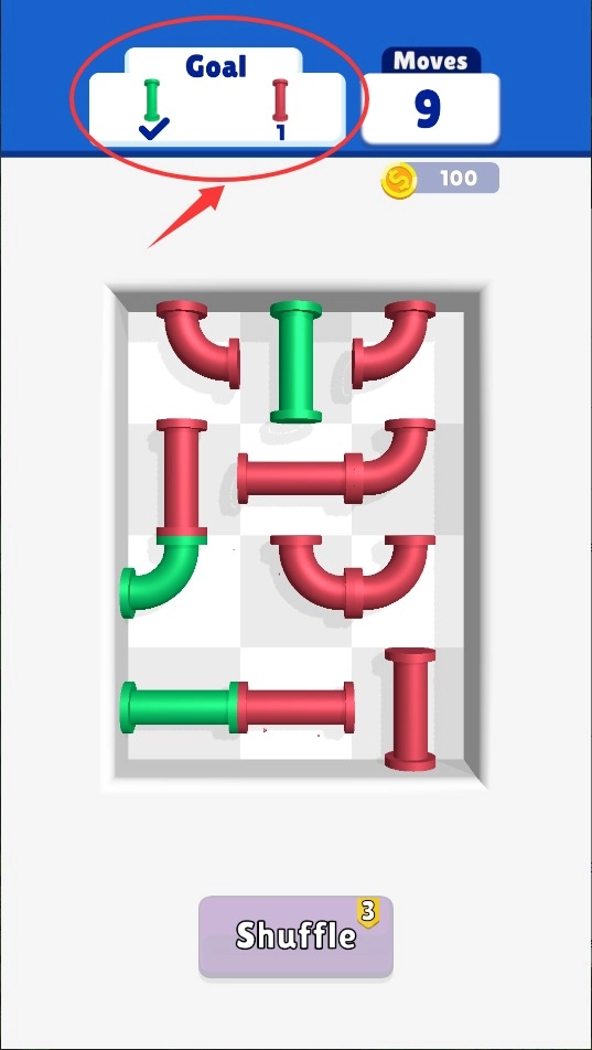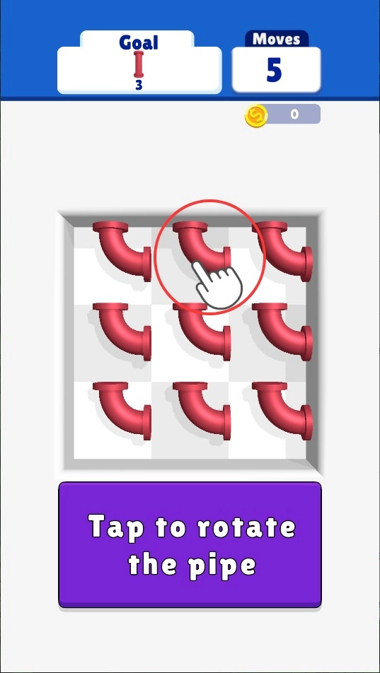 1、点击屏幕调整管道朝向,把相同颜色的管口对接起来,每次旋转都会消耗步数,得注意合理规划。