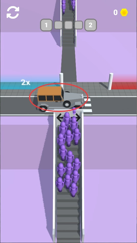 3、引导人群穿过彩色拱门可增加队伍人数,合理规划路线让更多乘客成功登船以获得更高评分。