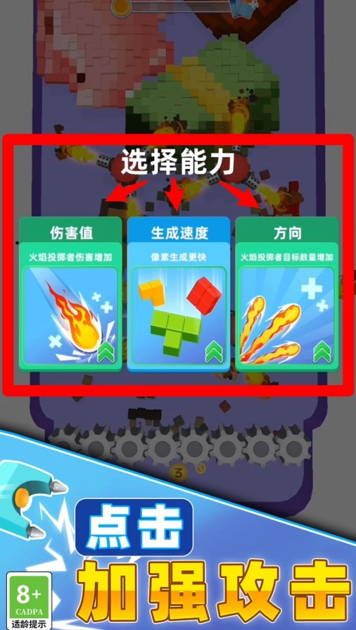 1. 合理挑选强化选项:每通过几关就会出现“方向”“伤害”“生成”这三类升级选择。