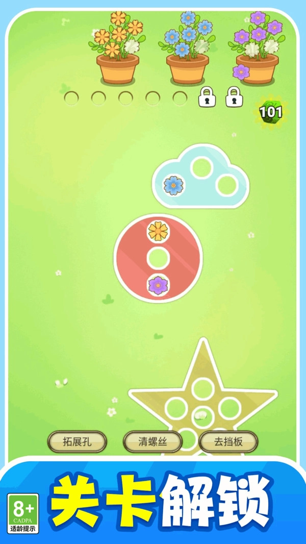 当遇到难搞的关卡时,游戏里有不少好用的道具能帮上忙:拓展孔能让你的操作范围变大,清螺丝道具则可以帮你迅速清理掉挡路的障碍。