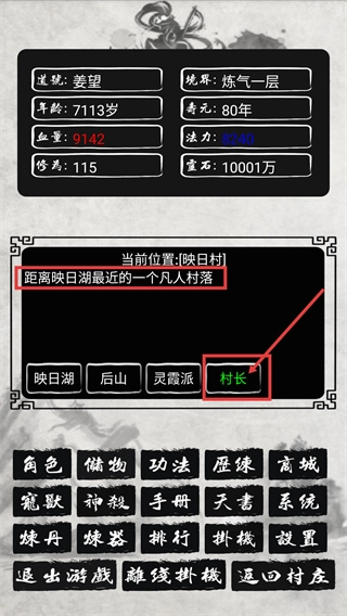 当处于【当前位置-映日村】(这是距离映日湖最近的凡人村落)时,点击【村长】选项来触发互动,以此推进剧情和任务。
