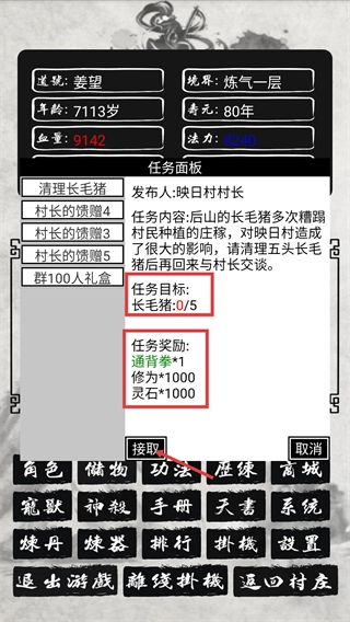 在任务面板里,接取【清理长毛猪】这个任务,它的目标是【长毛猪-0/5】,完成该任务后能得到【通背拳1】之类的奖励。