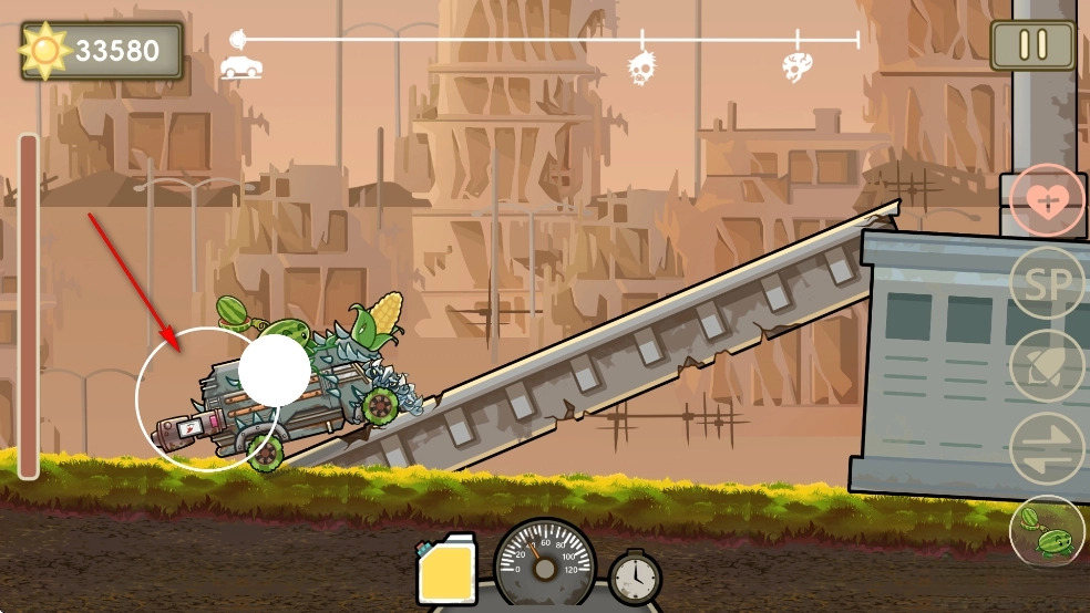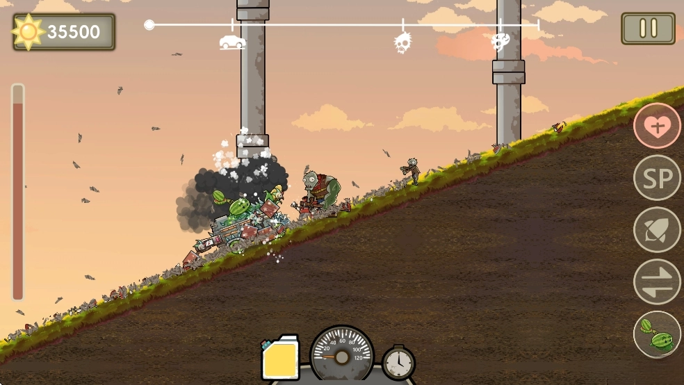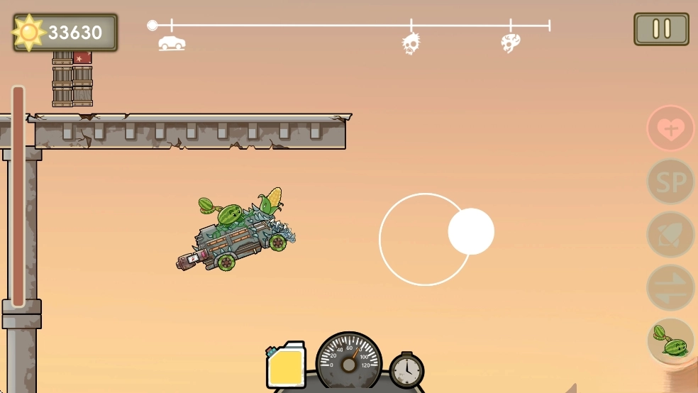 在末日风的横版关卡中,“戴夫房车”开启闯关之旅。操作上,左手负责战车的前进、跳跃与车头角度调整,右手则掌控车载植物武器系统——通过收集阳光来购买豌豆射手、火焰西瓜等植物进行部署,玩家需根据僵尸的不同类型,灵活搭配输出型或防御型植物阵容,最终目标是顺利抵达关卡终点,或是消灭指定的僵尸目标。