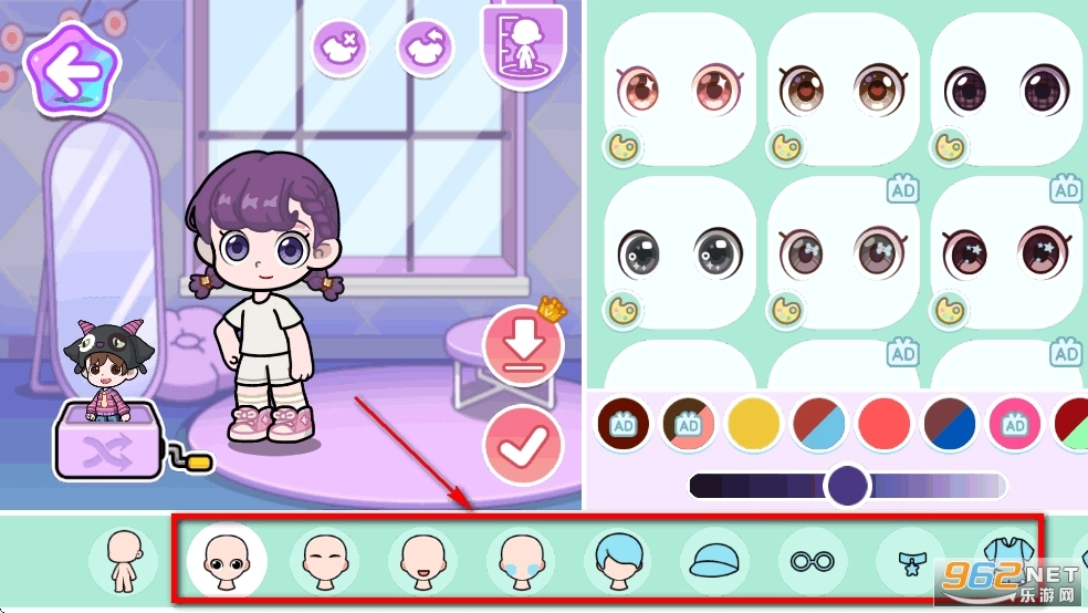 点击下方的如图按钮可以去调整角色的眼睛、眉毛、服装等等