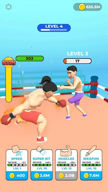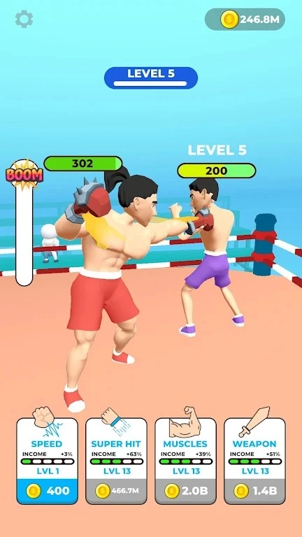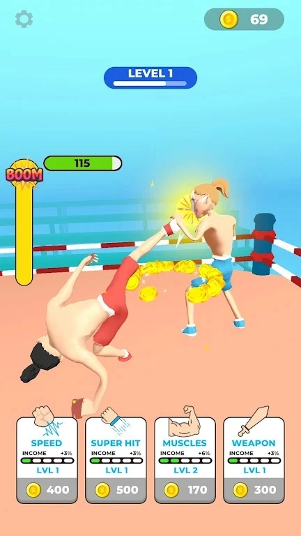 放置格斗拳击手是一款策略格斗闯关游戏,融合了点击器、策略升级等多种元素,玩家将能体验一场充满策略性的拳击对决。游戏中,玩家可通过点击屏幕赚取金币,并用金币提升拳击手的速度、肌肉、力度和武器等各项属性。随着关卡的推进,擂台上会出现越来越强壮的对手,只有持续升级才能赢得胜利!